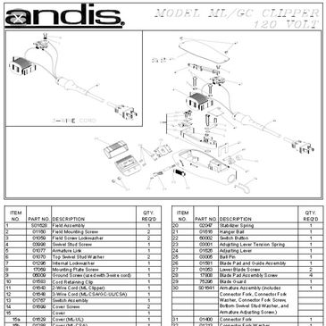 Andis clipper parts diagram. Andis T Outliner Wiring Diagram. If you use the Andis T-Outliner, and you've found that there's a rattling or Diagram of the clipper: schematron.org that any wires that have become untucked are repositioned inside the case. Andis T-Outliner Hair Trimmer, wire diagram related issues. Get free help, solutions & advice from top Andis experts. Ryan's Pet Supplies carries parts for your Andis, Oster and Wahl grooming clippers. Whether it's a cord, switch, motor or even a different colored housing, you can always Rely on Ryan's for all of your parts replacement needs. Andis GC farming parts - manufacturer-approved parts for a proper fit every time! We also have installation guides, diagrams and manuals to help you along the way! Clipper Parts By Brand. Andis Clipper Parts. AG Clipper. AG 2 / Super 2. AGC 2 / AGC Super 2. AGC / UltraEdge Clipper. BG Clipper. BGC / Excel Clippers. BGR+, BGRC, AGR+, AGRC Clippers.