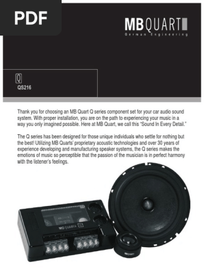 Thank you for choosing MB Quart Premium speakers for your car audio sound system. With proper installation, you are on the path to experiencing your music ...10 pages Q-Line Manuals. Onyx Subwoofer Manual. 2010 MB Quart Q Amplifier Manual. 2010 MB Quart QS216 Speaker Manual. Q 216 manual. QM 215 manual. QM 218 manual. QSC 164 manual. QSC 210 manual. QSC 213 manual. QSC 216 manual. QSD 164 manual. QSD 210 manual. QSD 216 manual. QSF 213 nano manual. QSF 216 nano manual. QTD 25 manual. Reference Manuals. 2010 ... 31 Jul 2018 — I have MB quart reference rxe 216 crossover and need to know how to ... try 12voltresource.com or google "wiring diagrams for car audio". Jeep® Vehicle Kits Product Manuals. JC1-108 Front Upper Dash or Rear Soundbar Speakers Kit: Installation Manual (Rev01) JC1-116E Front Lower Dash Speakers Kit: Installation Manual (Rev01) JC1-169SB Rear Speakers Kit: Installation Manual (Rev02) JS1-316 Front Dash Component Speakers Kit: Installation Manual (Rev01) MBQJ-ACC-1/MBQJ-ACC-1AH ...