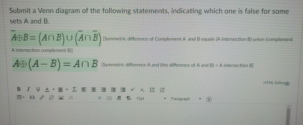 This is what my venn diagram looks like currently. I want it to look something like this. This is what I have so far \\documentclass[12pt]{article} \\usepackage{amsmath} \\usepackage[mar... In order to make a Venn diagram for (A ∩ C′) ∪ B′, we need to compare the Venn diagram for A ∩ C′ with the Venn diagram for B′ using the simple rule for union. However, in order to do that, we must first make a Venn diagram for A ∩ C′. We do so by comparing the Venn diagram for A with the Venn diagram for C′, using the simple The union of two sets is represented by ∪. (Don't confuse this symbol with the letter "u.") This is a two-circle Venn diagram. The green circle is A, and the blue circle is B. The complete Venn diagram represents the union of A and B, or A ∪ B. Feel free to click on the image to try this diagram as a template.