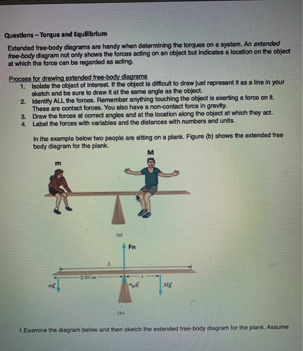 Free body diagrams • A free body diagram shows a body isolated from other bodies • All external forces and torques acting on it are shown To solve for a body in equilibrium: 1. Decide on the body of interest 2. Draw a diagram of the body isolated from other bodies in contact with it 3. Show all forces and torques acting on the body Download scientific diagram | Free body diagram for the calculation of the joint force and torque of the upper trunk seg- ment. from publication: Kinetic ... what does a free body diagram involving torque look like? This is a free body diagram of a yo-yo resting on a table. The force of gravity acting on the yo-yo (green arrow) is pulling downward on the yo-yo as it would on any object in ideal circumstances.
