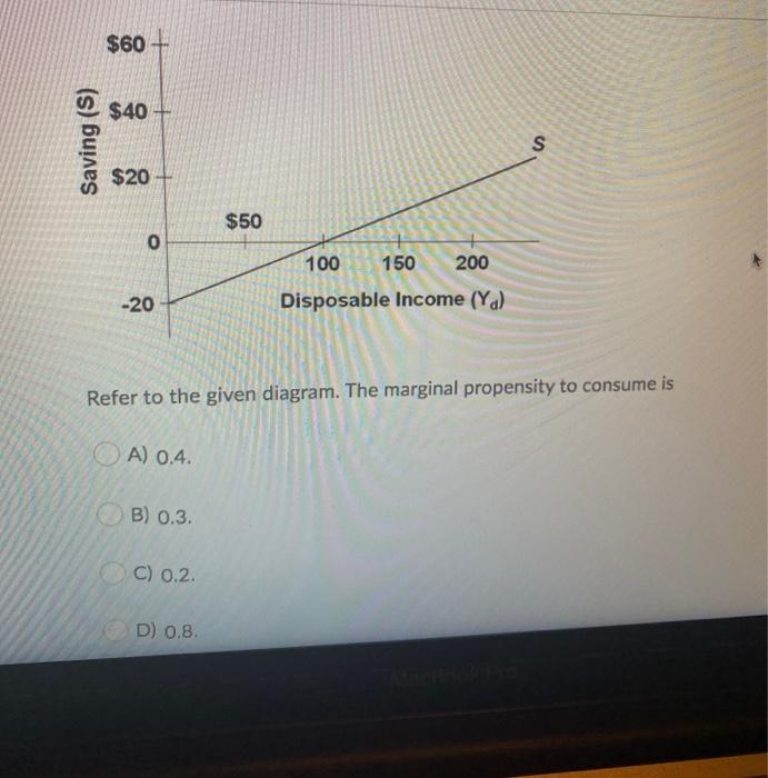 With a marginal propensity to save of .4, the marginal propensity to consume will be: a. 1.0 minus .4. b. .4 minus 1.0. c. the reciprocal of the MPS. d. .4. a. The MPC for an economy is: a. the slope of the consumption schedule or line. b. the slope of the savings schedule or line. c. 1 divided by the slope of the consumption schedule or line. d. 1 divided by the slope of the savings schedule ... Income Refer to the diagram. The marginal propensity to consume is Mutiple Choice 0.5 0.8 04. 06. Question: Income Refer to the diagram. The marginal propensity to consume is Mutiple Choice 0.5 0.8 04. 06.