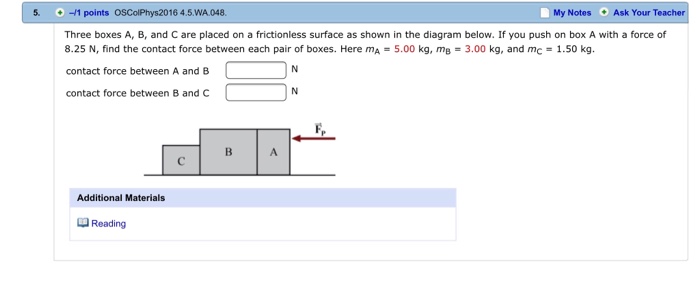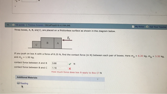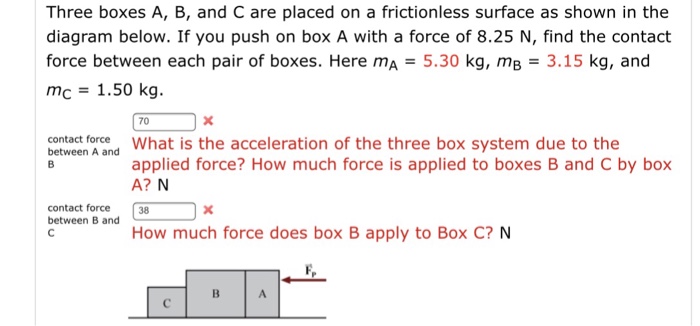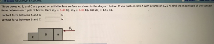Physics. Three boxes A, B, and C are placed on a frictionless surface as shown in the diagram below. If you push on box A with a force of 8.25 N, find the magnitude of the contact force between each pair of boxes. Here mA = 6.90 kg, mB = 3.80 kg, and mC = 1.50 kg. contact force between A and B?