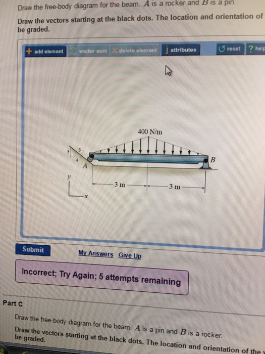 Draw the free-body diagram for the beam. A is a rocker and B is a pin.. Draw the vectors starting at the black dots. The location and orientation of the vectors will be graded.