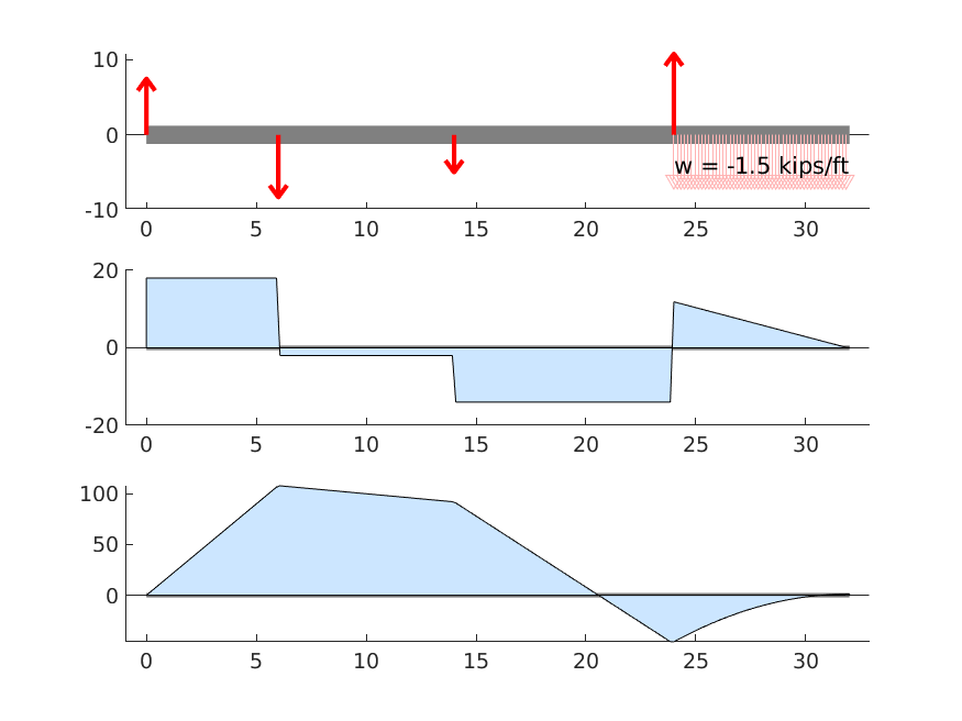 This program calculates the shear force and bending moment profiles, draw. the free body, shear force and bending moment diagrams of the problem. Under the free body diagram, the equations of each section is clearly. written with Latex. To use this program, you call the function placing the arguments in cells.