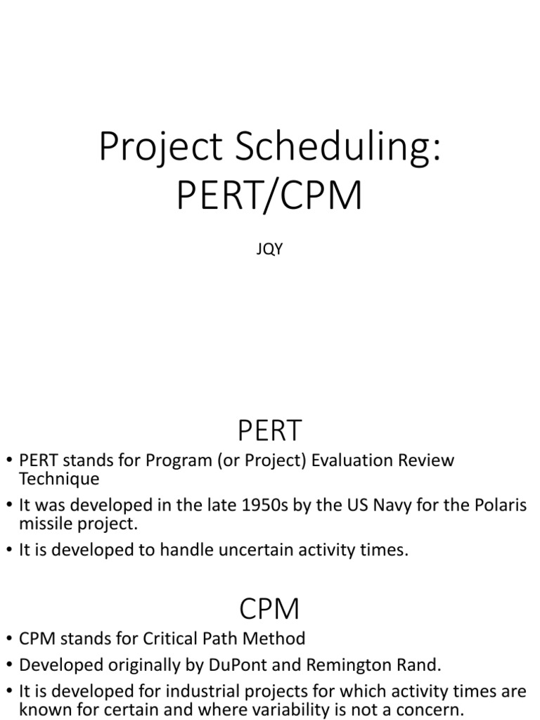 PDM was developed subsequent to the PERT/CPM techniques and its function is to permit a more accurate depiction of relationships among various activities. How ...Missing: reflect | Must include: reflect
