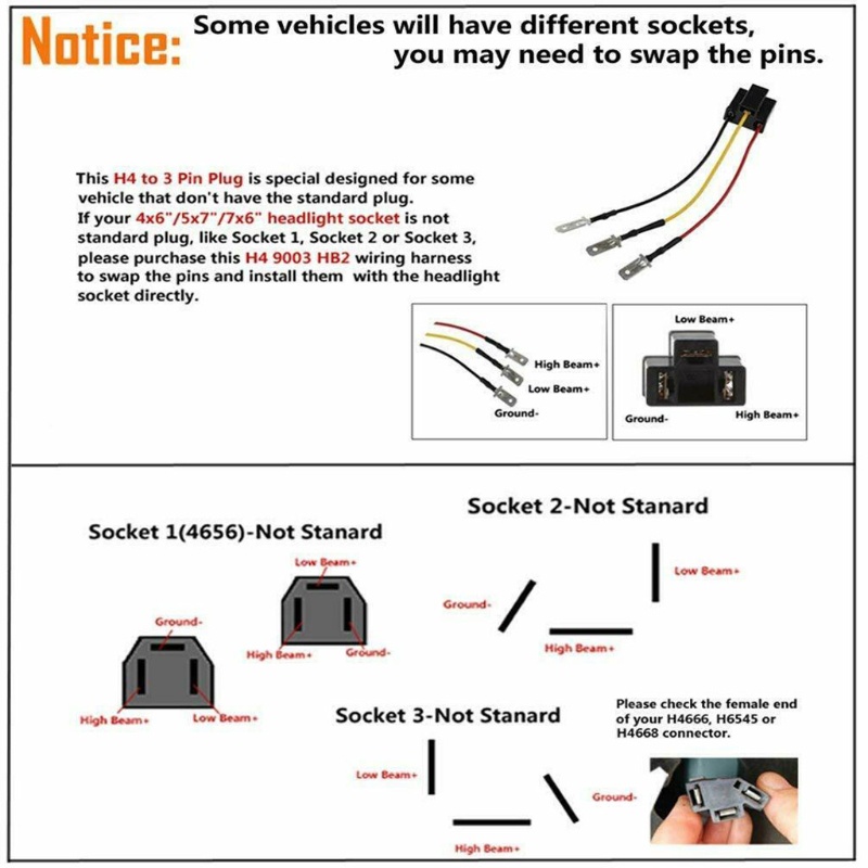 Kaslight ceramic h4 sockets h4 9003 hb2 wiring harness h4 to 3 pin adapter headlight connector for 4"x6" 7"x6" 5"x7" inch car truck boat marine ...