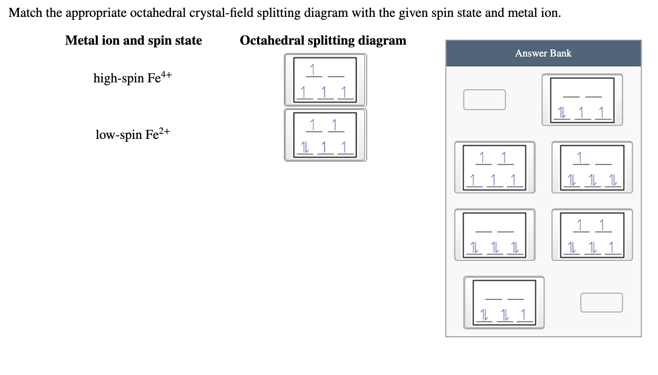 Ans. If the element present in high spin …. View the full answer. Transcribed image text: Match the appropriate octahedral crystal-field splitting diagram with the given spin state and metal ion. Metal ion and spin state Octahedral splitting diagram Answer Bank high-spin Fe4+ 1 1 1 1 1 1 1 1 low-spin Co2+ 1 1 1 1 1 1 11 1 1 1 1 1 1 1 1 1 1.