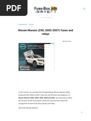 Jan 20, 2021 · Fuse box diagrams for Nissan Murano (Z50; 2002, 2003, 2004, 2005, 2006 and 2007 model year). Photos, layout and assigment of electrical fuses and relays.