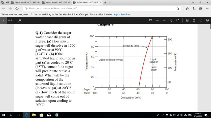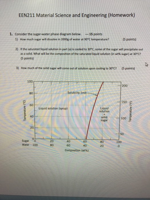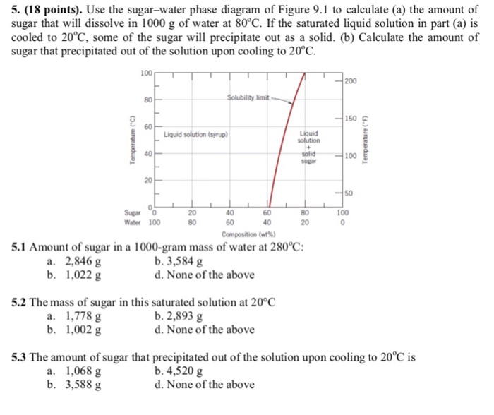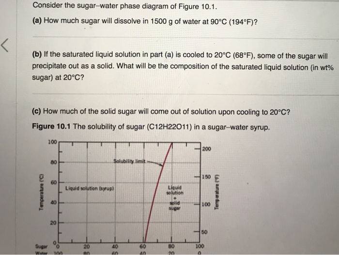 Phase diagram questions. 14:440:407 ch9 Question 9.1 Consider the sugar-water phase diagram of Figure 9.1. (a) How much sugar will dissolve in 1500 g water at 90°C (194°F)? (b) If the saturated liquid solution in part (a) is cooled to 20°C (68°F), some of the sugar will precipitate out as a solid. What will be the composition of the ...