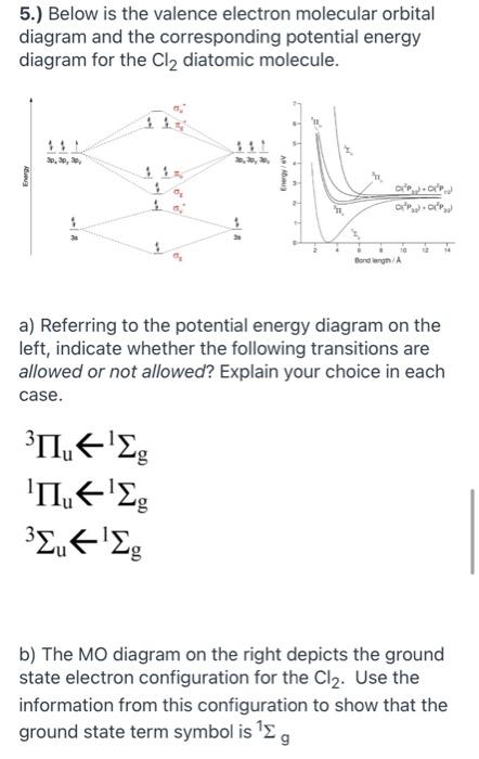 Solved 5) Draw the molecular orbital diagram for Cl2 ... 5) Draw the molecular orbital diagram for Cl2. Assume 3s and 3p orbitals show similar LCAO as 2s and 2p orbitals (Label increasing energy using an arrow next to the diagram. Label each atomic and each molecular orbital) Calculate the bond order and give the molecular orbital configuration for the valence electrons.
