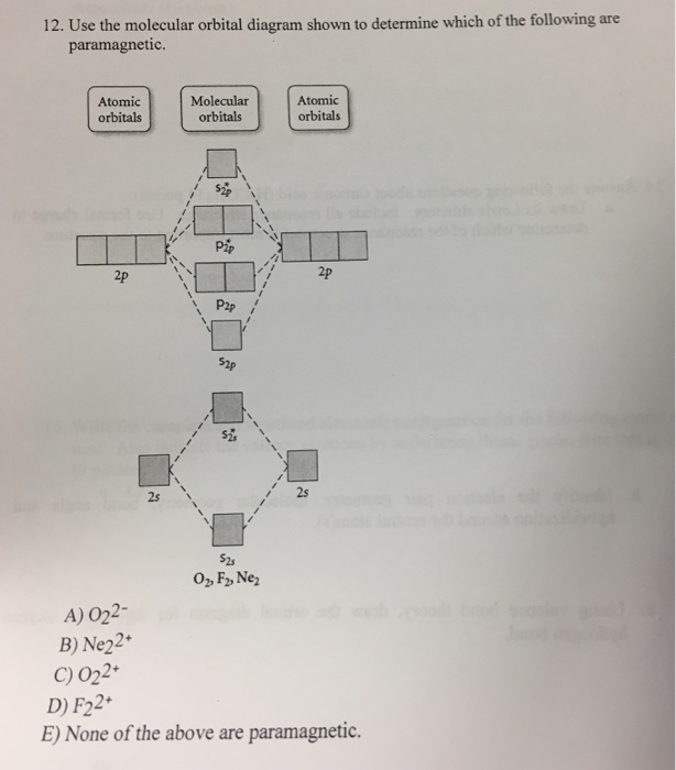 Solved Use the molecular orbital diagram shown to ... We review their content and use your feedback to keep the quality high. Transcribed image text: 10. Use the molecular orbital diagram shown to determine which of the following are paramagnetic Atomic orbitals Molecular orbitals Atomic orbitals pふ 2p 2p P2p 2s /2s 2s A) B22 B) B22- C) N22 D) C22- E) B2.