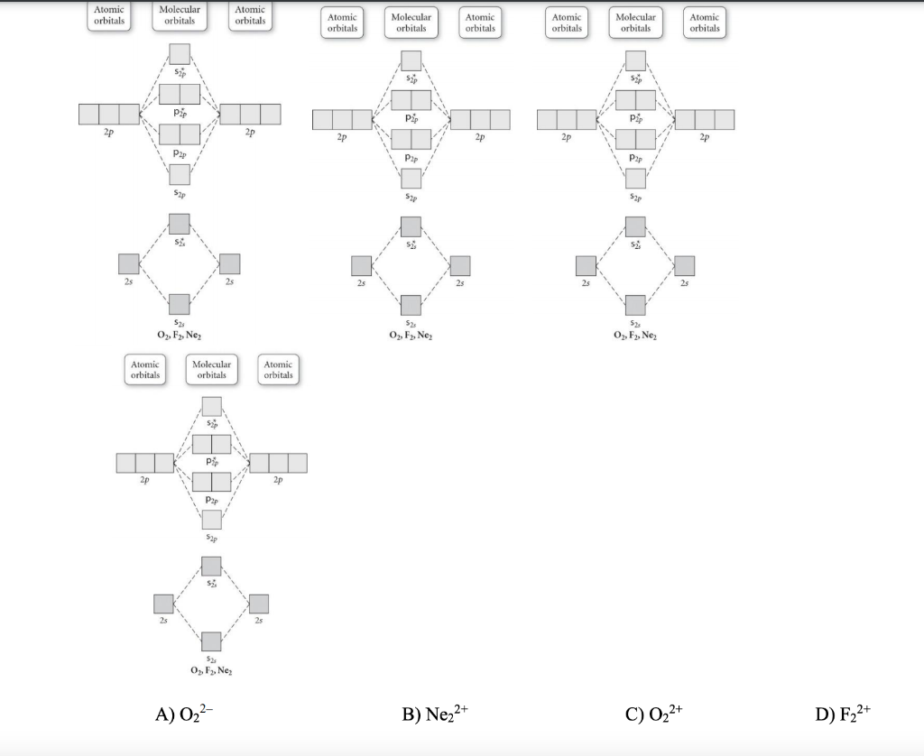 chemistry 1a Chapter 10 Flashcards | Quizlet Use the molecular orbital diagram shown to determine which of the following is most stable A) Ne2^2⁺ B) F2^2⁺ C) F2^2⁻ D) F2 E) O2^2⁺ E). O2^2⁺ Use the molecular orbital diagram shown to determine which of the following are paramagnetic. A) O2 2⁺ ...