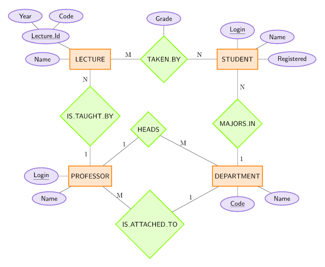 * Primary keys * Foreign keys * Multiplicity (whether a relationship between entity sets is one-to-one, one-to-many or What are the uses of an ER diagram in software engineering? Foreign keys are most often used to join two tables — from a foreign key in one table to a primary key in another table. An ER model can also be expressed in a verbal form, for example: one building may be divided into zero Diagrams created to represent attributes as well as entities and relationships may be called In a relational database a relationship between entities is implemented by storing the primary key of... In an ER diagram, primary keys are indicated by ____. Underlining. In the ERD, cardinality is indicated using the ____ notation. Min,Max. Knowing the ____ number of ... ER Diagram Representation, Let us now learn how the ER Model is represented by means of an ER diagram. Any object, for example, entities, attributes of an Name of the relationship is written inside the diamond-box. All the entities (rectangles) participating in a relationship, are connected to it by a line.