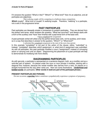 Sentence Diagramming for High School - SILO.PUB A participle is a verb form that functions in a sentence as an adjective. Present participles end in -ing. Most past participles end in -ed but some have irregular forms. Participles To diagram a sentence that includes a participle, first identify the word that the participle modifies. Diagramming Participle Phrase and Similar Products and ... Participles A PARTICIPLE is a verbal modifier ending in "-ing" or "-ed," depending on whether it is a PRESENT PARTICIPLE or a PAST PARTICIPLE. The "-ing" ending is also an ending used in the continuous tense form of verbs, and an "-ed" ending is used with the perfect tense form of verbs. welcome to diagramming sentences! PDF Sentence Diagramming - Weebly Diagramming The Sentence Diagram A sentence diagram is a picture of how the parts of a sentence fit together. It shows how the words in the sentence are related. Subjects and Verbs To diagram a sentence, first find the simple subject and the verb (simple predicate), and write them on a horizontal line. Then, separate them with a vertical line. 7: Perfect tenses and participles | A Foundation Course in ... The participles of German regular (also called "weak") verbs are usually formed simply by adding ge - before the stem of the infinitive and ending with - t or - et. Thus, gesagt is the past participle of sagen, gewartet is that of warten. You will not find regular-verb participles listed separately in your dictionary, so you must be ...