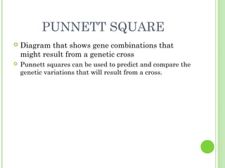 K Keystone PP Chapter11.1-11.3 Introduction to Genetics ... GENOTYPE genetic makeup or what combinations of alleles form from a cross Punnett Squares Diagram used to show the gene combinations that might result from a genetic cross Parent alleles shown on...