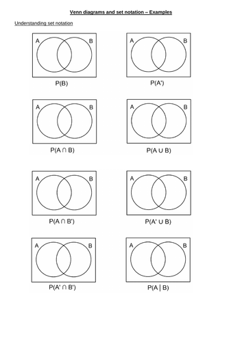 probability notation venn diagrams - youngk314.com This is a two-circle Venn diagram. Venn diagram worksheet with answers pdf. 13 / 80. by lweinand. Set notation questions. Venn Diagrams Solving problems using Venn diagrams. You may be asked to solve problems using Venn diagrams in an exam. It is really important you draw the Venn diagram and add information as you go along. Exercises Solutions 1.