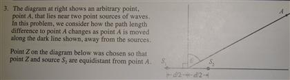 Solved The diagram at right shows an arbitrary point ... The diagram at right shows an arbitrary point, point A, that lies near two point sources of waves. In this problem, we consider how the path length difference to point A changes as point A is moved along the dark line shown, away from the sources. Point Z on the diagram below was chosen so that point Z and source S2 are equidistant from point A.