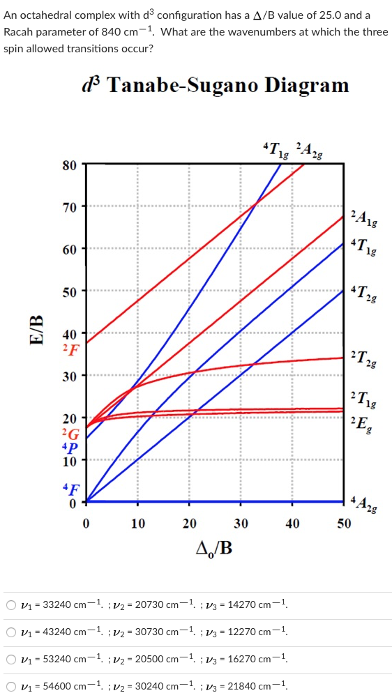 Using Tanabe-Sugano diagram calculate Δο and B for | Chegg.com Question: Using Tanabe-Sugano diagram calculate Δο and B for the complex VC13(CH3CN)3, which has absorption bands at 694 and 467 nmm . This question hasn't been solved yet Ask an expert Ask an expert Ask an expert done loading. Please show the solution in detail and explain it.