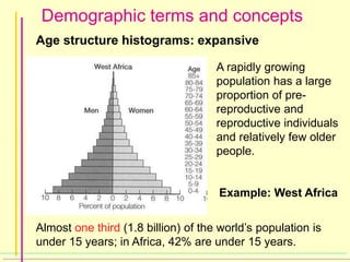 Human Population Growth | Boundless Biology Population bar graphs for stages of demographic change from expansion to contraction: The leftmost diagram (representing the age structure of a rapidly-growing population) indicates that the number of individuals decreases rapidly with age. The slow-growth model shows that the proportion of individuals decreases steadily with age.