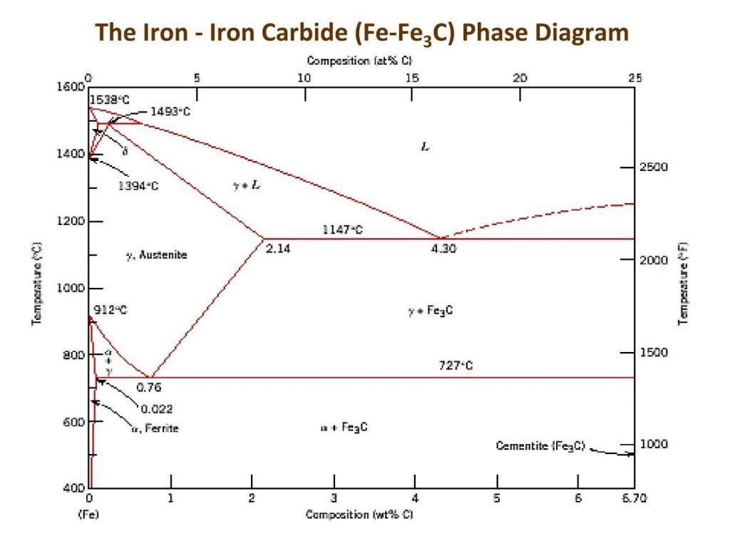 Phase Diagram of Steel - Metallurgy for Dummies Fe-Fe 3 C Phase Diagram, Materials Science and Metallurgy, 4th ed., Pollack, Prentice-Hall, 1988. Figure above shows the equilibrium diagram for combinations of carbon in a solid solution of iron. The diagram shows iron and carbons combined to form Fe-Fe3C at the 6.67%C end of the diagram.