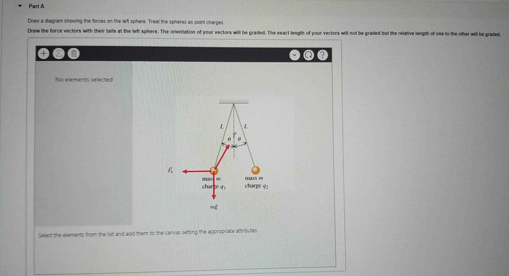 ANSWER Hint 2 How to obtain E E Once the torque is ... When the spheres are given equal charges, so that q 1 = q 2 = q, each thread hangs at an angle θ theta = 27.0 from the vertical. Part A Draw a diagram showing the forces on the left sphere. Treat the spheres as point charges. Draw the force vectors with their tails at the left sphere. The orientation of your vectors will be graded.